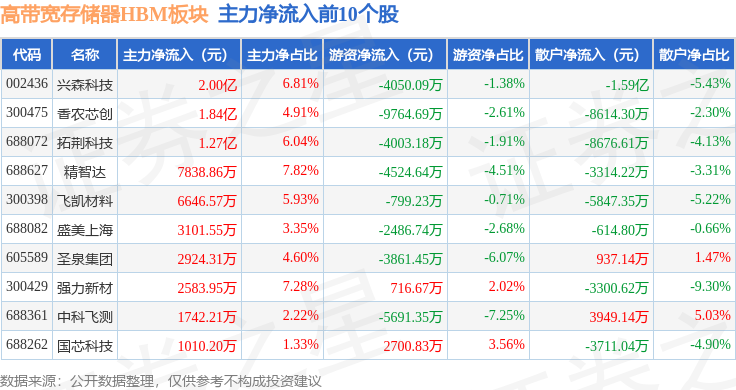 从资金流向上来看,当日高带宽存储器HBM板块主力资金净流入1.51亿元,游资资金净流出7886.58万元,散户资金净流出7259.45万元。高带宽存储器HBM板块个股资金流向见下表: