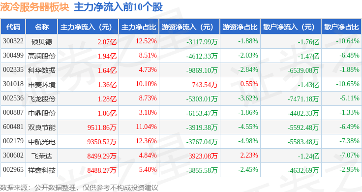 从资金流向上来看,当日液冷服务器板块主力资金净流出38.83亿元,游资资金净流入11.29亿元,散户资金净流入27.53亿元。液冷服务器板块个股资金流向见下表: