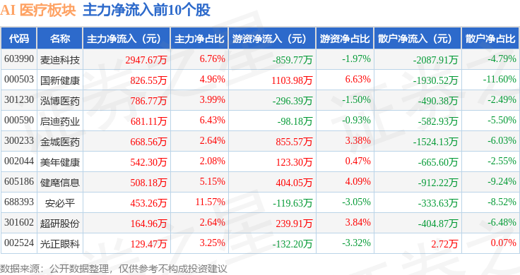 从资金流向上来看,当日AI 医疗板块主力资金净流出4.55亿元,游资资金净流入1.6亿元,散户资金净流入2.96亿元。AI 医疗板块个股资金流向见下表: