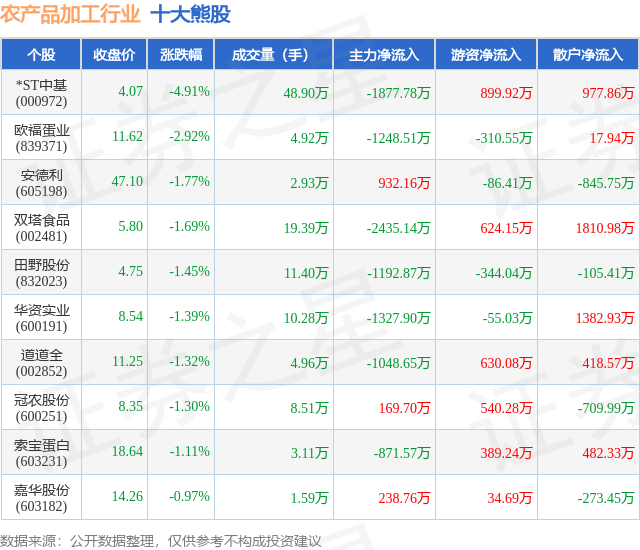 个股表现方面,农产品加工行业当日领跌股为*ST中基(000972),该股当日报收4.07,下跌4.91%,成交量48.9万,主力资金净流出1877.78万元。欧福蛋业(839371)以下跌2.92%紧随其后,该股当日成交量4.92万,主力资金净流出1248.51万元。除此之外,安德利(605198)、双塔食品(002481)、田野股份(832023)均进入当日熊股之列。具体个股列表见下表: