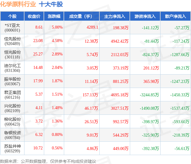 个股表现方面,化学原料行业当日领涨股为*ST亚太(000691),该股当日报收8.61,上涨5.0%,成交量4289.0,主力资金净流入198.38万元。佳先股份(920489)以上涨4.58%紧随其后,该股当日成交量12.38万,主力资金净流入4942.42万元。除此之外,恒光股份(301118)、迪尔化工(831304)、振华股份(603067)均进入当日牛股之列。具体个股列表见下表: