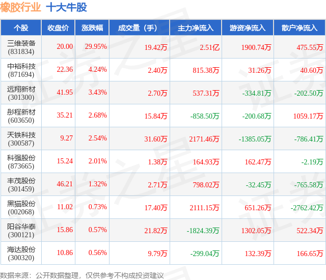 个股表现方面,橡胶行业当日领涨股为三维装备(831834),该股当日报收20.0,上涨29.95%,成交量19.42万,主力资金净流入2.51亿元。中裕科技(871694)以上涨4.24%紧随其后,该股当日成交量2.4万,主力资金净流入815.38万元。除此之外,远翔新材(301300)、彤程新材(603650)、天铁科技(300587)均进入当日牛股之列。具体个股列表见下表: