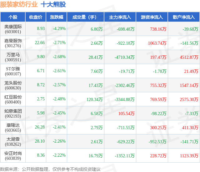 个股表现方面,服装家纺行业当日领跌股为奥康国际(603001),该股当日报收8.93,下跌4.29%,成交量6.8万,主力资金净流出698.48万元。嘉曼服饰(301276)以下跌2.71%紧随其后,该股当日成交量2.66万,主力资金净流出922.18万元。除此之外,万里马(300591)、ST尔雅(600107)、龙头股份(600630)均进入当日熊股之列。具体个股列表见下表: