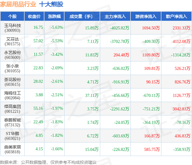 个股表现方面,家居用品行业当日领跌股为玉马科技(300993),该股当日报收16.75,下跌5.63%,成交量15.89万,主力资金净流出4025.82万元。艾芬达(301575)以下跌5.53%紧随其后,该股当日成交量7.11万,主力资金净流出3702.78万元。除此之外,永艺股份(603600)、张小泉(301055)、茶花股份(603615)均进入当日熊股之列。具体个股列表见下表: