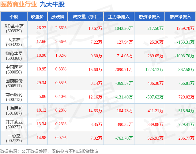 个股表现方面,医药商业行业当日领涨股为XD益丰药(603939),该股当日报收26.22,上涨2.66%,成交量10.67万,主力资金净流出1042.2万元。大参林(603233)以上涨2.56%紧随其后,该股当日成交量7.22万,主力资金净流入127.94万元。除此之外,柳药集团(603368)、中国医药(600056)、国药股份(600511)均进入当日牛股之列。具体个股列表见下表: