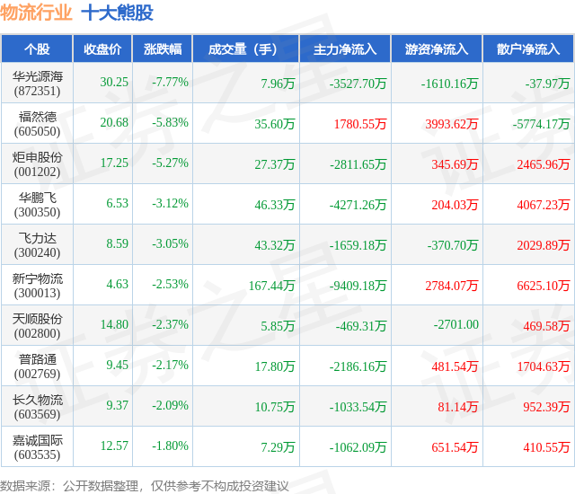 个股表现方面,物流行业当日领跌股为华光源海(872351),该股当日报收30.25,下跌7.77%,成交量7.96万,主力资金净流出3527.7万元。福然德(605050)以下跌5.83%紧随其后,该股当日成交量35.6万,主力资金净流入1780.55万元。除此之外,炬申股份(001202)、华鹏飞(300350)、飞力达(300240)均进入当日熊股之列。具体个股列表见下表: