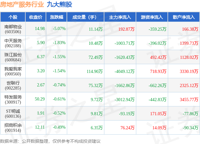 个股表现方面,房地产服务行业当日领跌股为南都物业(603506),该股当日报收14.98,下跌5.07%,成交量11.14万,主力资金净流入192.87万元。中天服务(002188)以下跌1.83%紧随其后,该股当日成交量10.48万,主力资金净流出1003.71万元。除此之外,珠江股份(600684)、我爱我家(000560)、世联行(002285)均进入当日熊股之列。具体个股列表见下表: