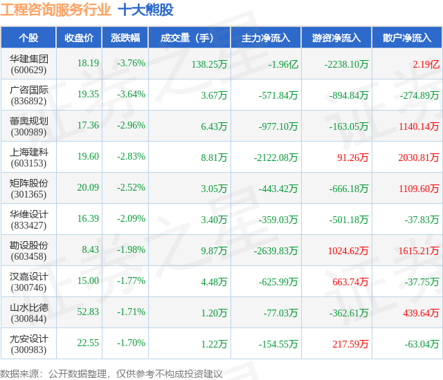个股表现方面,工程咨询服务行业当日领跌股为华建集团(600629),该股当日报收18.19,下跌3.76%,成交量138.25万,主力资金净流出1.96亿元。广咨国际(836892)以下跌3.64%紧随其后,该股当日成交量3.67万,主力资金净流出571.84万元。除此之外,蕾奥规划(300989)、上海建科(603153)、矩阵股份(301365)均进入当日熊股之列。具体个股列表见下表: