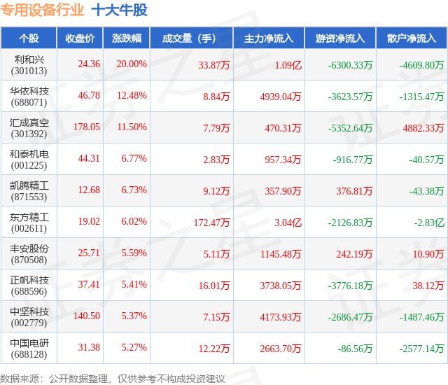 个股表现方面,专用设备行业当日领涨股为利和兴(301013),该股当日报收24.36,上涨20.0%,成交量33.87万,主力资金净流入1.09亿元。华依科技(688071)以上涨12.48%紧随其后,该股当日成交量8.84万,主力资金净流入4939.04万元。除此之外,汇成真空(301392)、和泰机电(001225)、凯腾精工(871553)均进入当日牛股之列。具体个股列表见下表: