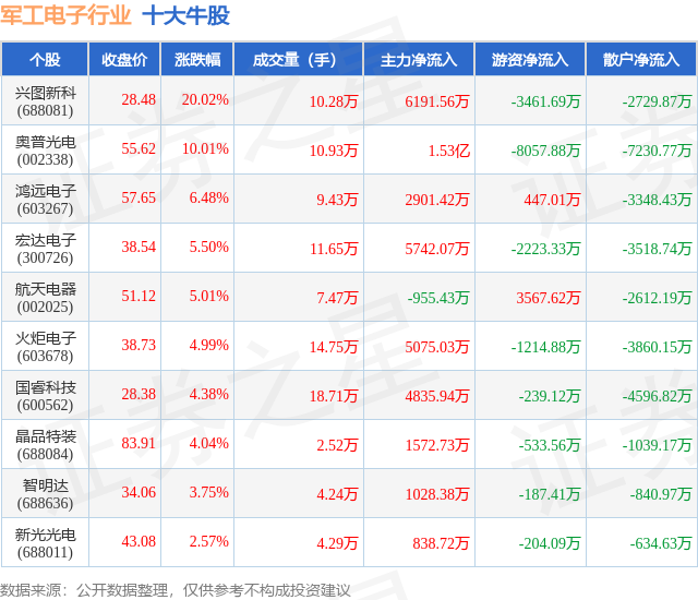 个股表现方面,军工电子行业当日领涨股为兴图新科(688081),该股当日报收28.48,上涨20.02%,成交量10.28万,主力资金净流入6191.56万元。奥普光电(002338)以上涨10.01%紧随其后,该股当日成交量10.93万,主力资金净流入1.53亿元。除此之外,鸿远电子(603267)、宏达电子(300726)、航天电器(002025)均进入当日牛股之列。具体个股列表见下表: