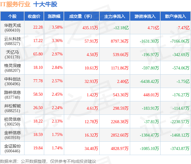 个股表现方面,IT服务行业当日领涨股为华胜天成(600410),该股当日报收22.28,上涨3.58%,成交量435.15万,主力资金净流出12.18亿元。云从科技(688327)以上涨3.36%紧随其后,该股当日成交量57.91万,主力资金净流入8797.36万元。除此之外,天亿马(301178)、格灵深瞳(688207)、中科创达(300496)均进入当日牛股之列。具体个股列表见下表: