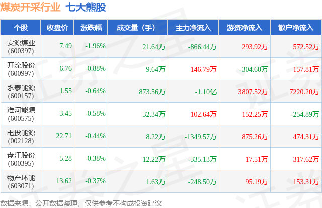 个股表现方面,煤炭开采行业当日领跌股为安源煤业(600397),该股当日报收7.49,下跌1.96%,成交量21.64万,主力资金净流出866.44万元。开滦股份(600997)以下跌0.88%紧随其后,该股当日成交量9.64万,主力资金净流入146.79万元。除此之外,永泰能源(600157)、淮河能源(600575)、电投能源(002128)均进入当日熊股之列。具体个股列表见下表: