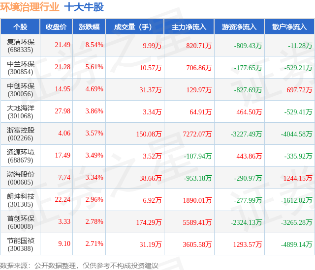 个股表现方面,环境治理行业当日领涨股为复洁环保(688335),该股当日报收21.49,上涨8.54%,成交量9.99万,主力资金净流入820.71万元。中兰环保(300854)以上涨5.61%紧随其后,该股当日成交量10.57万,主力资金净流入706.86万元。除此之外,中创环保(300056)、大地海洋(301068)、浙富控股(002266)均进入当日牛股之列。具体个股列表见下表: