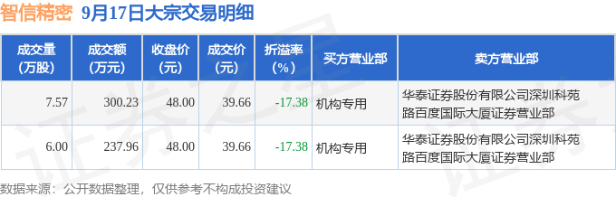证券之星消息,9月17日智信精密发生大宗交易,交易数据如下: