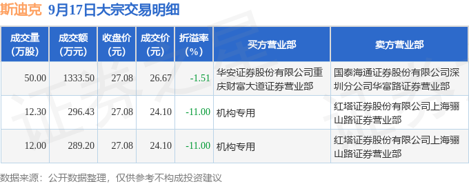 证券之星消息,9月17日斯迪克发生大宗交易,交易数据如下: