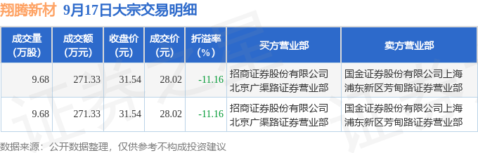 证券之星消息,9月17日翔腾新材发生大宗交易,交易数据如下:
