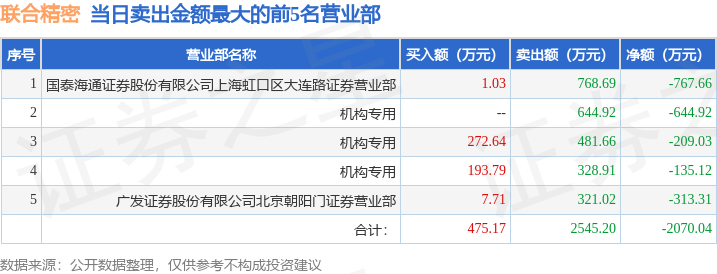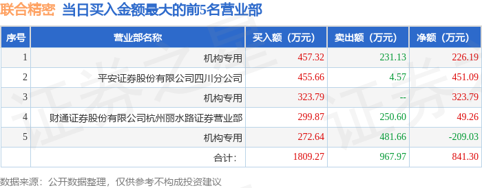 证券之星消息,沪深交易所2025年9月17日公布的交易公开信息显示,联合精密(001268)因日跌幅偏离值达到7%的前5只证券登上龙虎榜。此次是近5个交易日内第1次上榜。