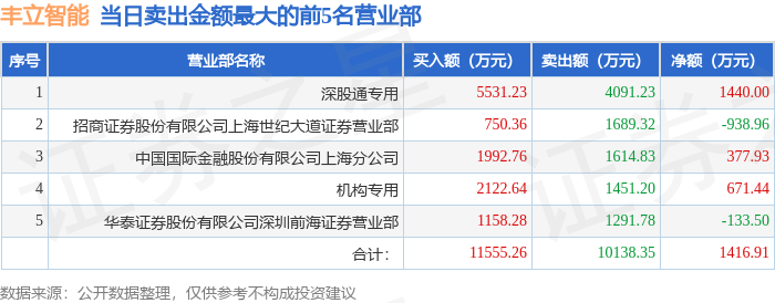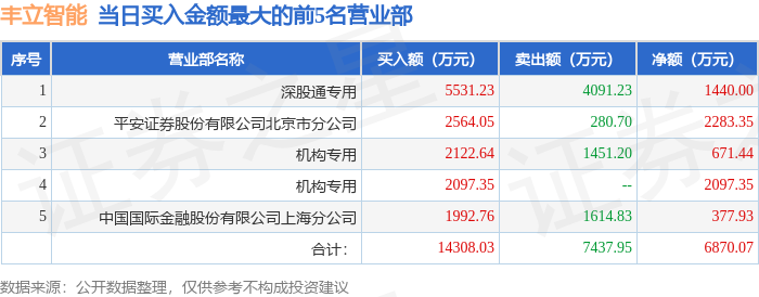 证券之星消息,沪深交易所2025年9月17日公布的交易公开信息显示,丰立智能(301368)因日换手率达到30%的前5只证券登上龙虎榜。此次是近5个交易日内第1次上榜。