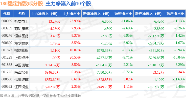 资金流向方面,180稳定(000125)指数成份股当日主力资金净流出合计33.08亿元,游资资金净流入合计5.77亿元,散户资金净流入合计27.31亿元。成份股资金流向详情见下表: