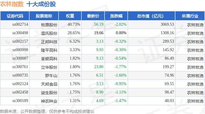 资金流向方面,农林指数(399231)成份股当日主力资金净流出合计6.58亿元,游资资金净流入合计9149.65万元,散户资金净流入合计5.66亿元。成份股资金流向详情见下表: