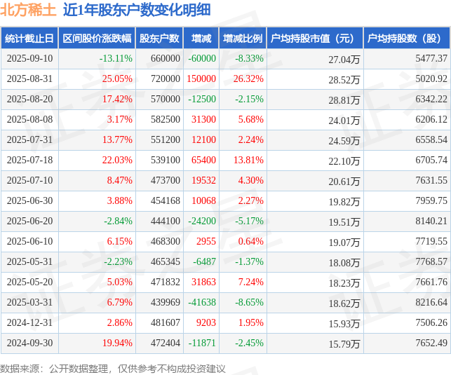 从股价来看,2025年8月31日至2025年9月10日,北方稀土区间跌幅为13.11%,在此期间股东户数减少6.0万户,减幅为8.33%。