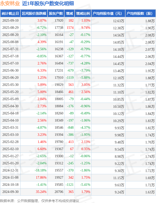 从股价来看,2025年8月29日至2025年9月10日,永安林业区间涨幅为3.07%,在此期间股东户数增加182.0户,增幅为1.03%。