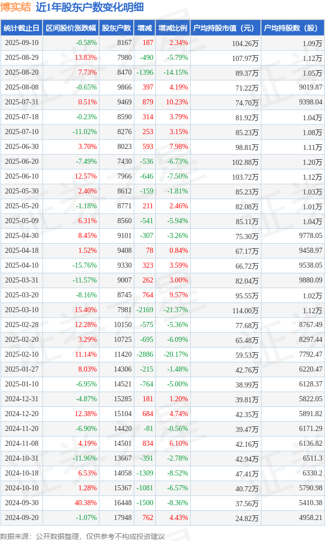 证券之星消息,近日博实结披露,截至2025年9月10日公司股东户数为8167.0户,较8月29日增加187.0户,增幅为2.34%。户均持股数量由上期的1.12万股减少至1.09万股,户均持股市值为104.26万元。