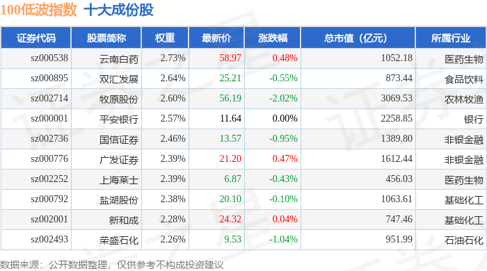 证券之星消息,9月17日,100低波(399645)指数报收于9481.13点,涨0.6%,成交599.76亿元,换手率0.95%。当日该指数成份股中,上涨的有24家,亿联网络以8.52%的涨幅领涨,下跌的有23家,海大集团以3.01%的跌幅领跌。