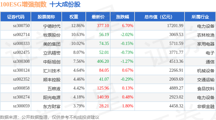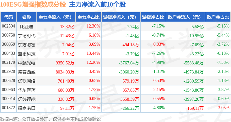 资金流向方面,100ESG增强(970033)指数成份股当日主力资金净流出合计20.55亿元,游资资金净流入合计10.16亿元,散户资金净流入合计10.39亿元。成份股资金流向详情见下表: