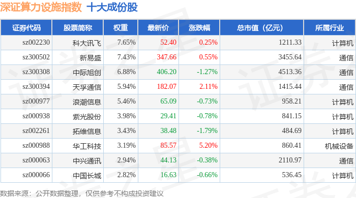 证券之星消息,9月17日,深证算力设施(970051)指数报收于11453.75点,涨0.36%,成交1093.11亿元,换手率3.82%。当日该指数成份股中,上涨的有19家,亿联网络以8.52%的涨幅领涨,下跌的有31家,易华录以2.6%的跌幅领跌。