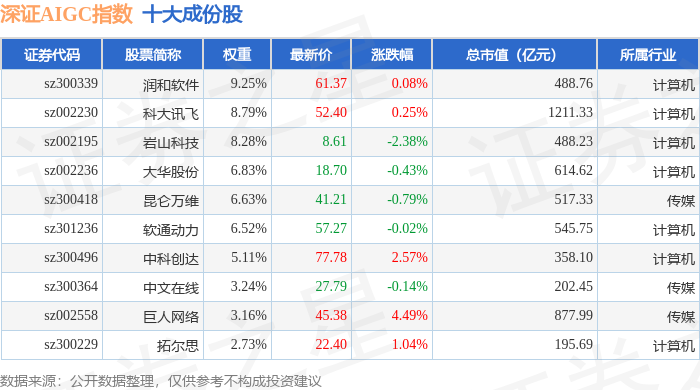 资金流向方面,深证AIGC(970075)指数成份股当日主力资金净流出合计5.3亿元,游资资金净流入合计1.6亿元,散户资金净流入合计3.71亿元。成份股资金流向详情见下表: