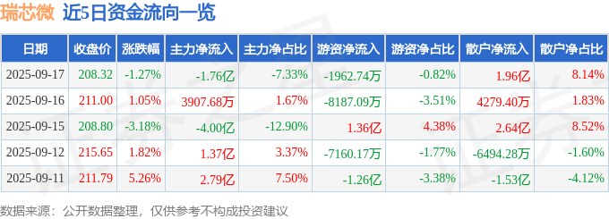 证券之星消息,截至2025年9月17日收盘,瑞芯微(603893)报收于208.32元,下跌1.27%,换手率2.73%,成交量11.47万手,成交额24.01亿元。