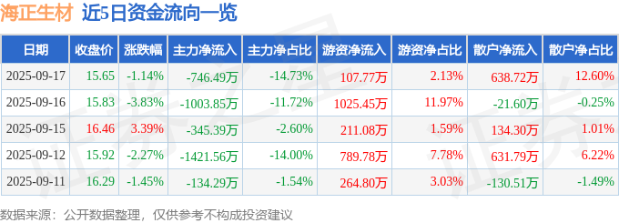 证券之星消息,截至2025年9月17日收盘,海正生材(688203)报收于15.65元,下跌1.14%,换手率2.61%,成交量3.24万手,成交额5068.01万元。