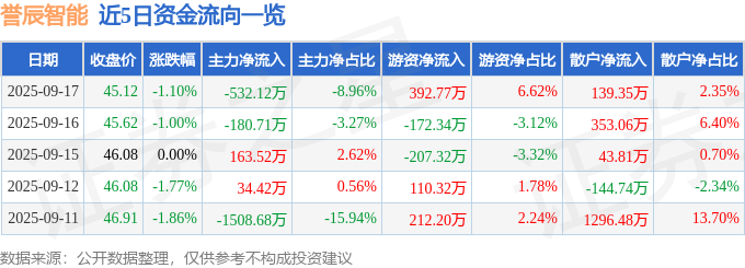 证券之星消息,截至2025年9月17日收盘,誉辰智能(688638)报收于45.12元,下跌1.1%,换手率4.92%,成交量1.3万手,成交额5937.47万元。