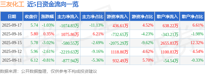 证券之星消息,截至2025年9月17日收盘,三友化工(600409)报收于5.74元,下跌1.03%,换手率0.81%,成交量16.81万手,成交额9657.79万元。
