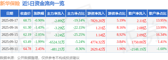 证券之星消息,截至2025年9月17日收盘,新华保险(601336)报收于60.75元,下跌0.9%,换手率1.19%,成交量24.73万手,成交额15.1亿元。