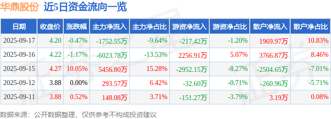 证券之星消息,截至2025年9月17日收盘,华鼎股份(601113)报收于4.2元,下跌0.47%,换手率3.9%,成交量43.07万手,成交额1.82亿元。