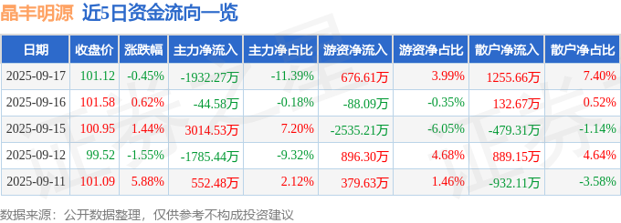 证券之星消息,截至2025年9月17日收盘,晶丰明源(688368)报收于101.12元,下跌0.45%,换手率1.9%,成交量1.67万手,成交额1.7亿元。