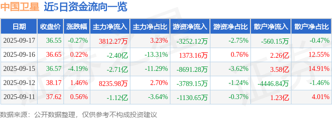 证券之星消息,截至2025年9月17日收盘,中国卫星(600118)报收于36.55元,下跌0.27%,换手率2.75%,成交量32.54万手,成交额11.81亿元。