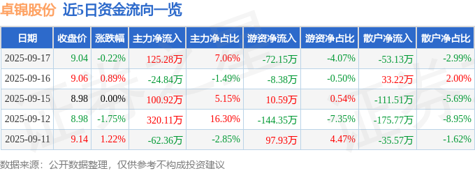 证券之星消息,截至2025年9月17日收盘,卓锦股份(688701)报收于9.04元,下跌0.22%,换手率1.46%,成交量1.96万手,成交额1774.14万元。