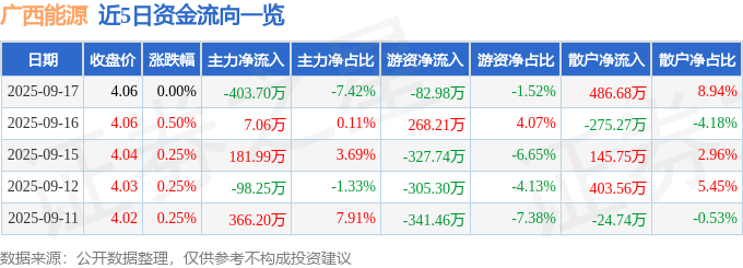 证券之星消息,截至2025年9月17日收盘,广西能源(600310)报收于4.06元,上涨0.0%,换手率0.92%,成交量13.43万手,成交额5443.89万元。