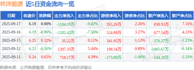证券之星消息,截至2025年9月17日收盘,林洋能源(601222)报收于6.19元,上涨0.0%,换手率0.92%,成交量18.93万手,成交额1.17亿元。