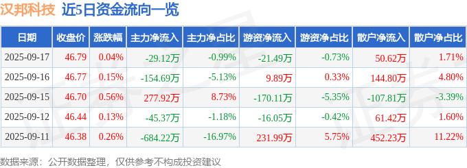 证券之星消息,截至2025年9月17日收盘,汉邦科技(688755)报收于46.79元,上涨0.04%,换手率3.82%,成交量6314.0手,成交额2953.71万元。