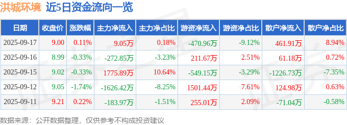 证券之星消息,截至2025年9月17日收盘,洪城环境(600461)报收于9.0元,上涨0.11%,换手率0.45%,成交量5.74万手,成交额5166.79万元。