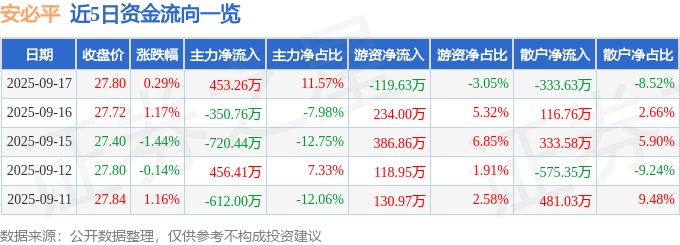 9月17日的资金流向数据方面,主力资金净流入453.26万元,占总成交额11.57%,游资资金净流出119.63万元,占总成交额3.05%,散户资金净流出333.63万元,占总成交额8.52%。