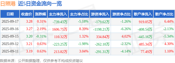 证券之星消息,截至2025年9月17日收盘,日照港(600017)报收于3.28元,上涨0.31%,换手率1.42%,成交量43.57万手,成交额1.43亿元。