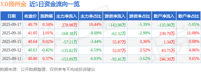 证券之星消息,截至2025年9月17日收盘,XD扬州金(603307)报收于40.79元,上涨0.34%,换手率3.83%,成交量6519.0手,成交额2673.28万元。