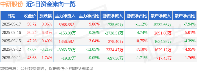 9月17日的资金流向数据方面,主力资金净流入5968.35万元,占总成交额9.06%,游资资金净流出735.69万元,占总成交额1.12%,散户资金净流出5232.66万元,占总成交额7.94%。