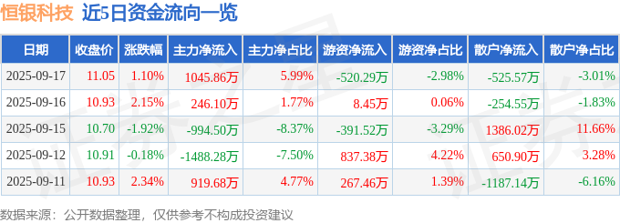证券之星消息,截至2025年9月17日收盘,恒银科技(603106)报收于11.05元,上涨1.1%,换手率3.05%,成交量15.88万手,成交额1.75亿元。