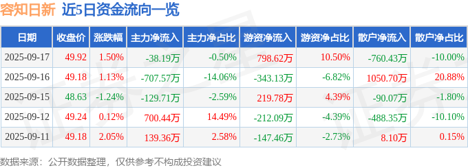 9月17日的资金流向数据方面,主力资金净流出38.19万元,占总成交额0.5%,游资资金净流入798.62万元,占总成交额10.5%,散户资金净流出760.43万元,占总成交额10.0%。